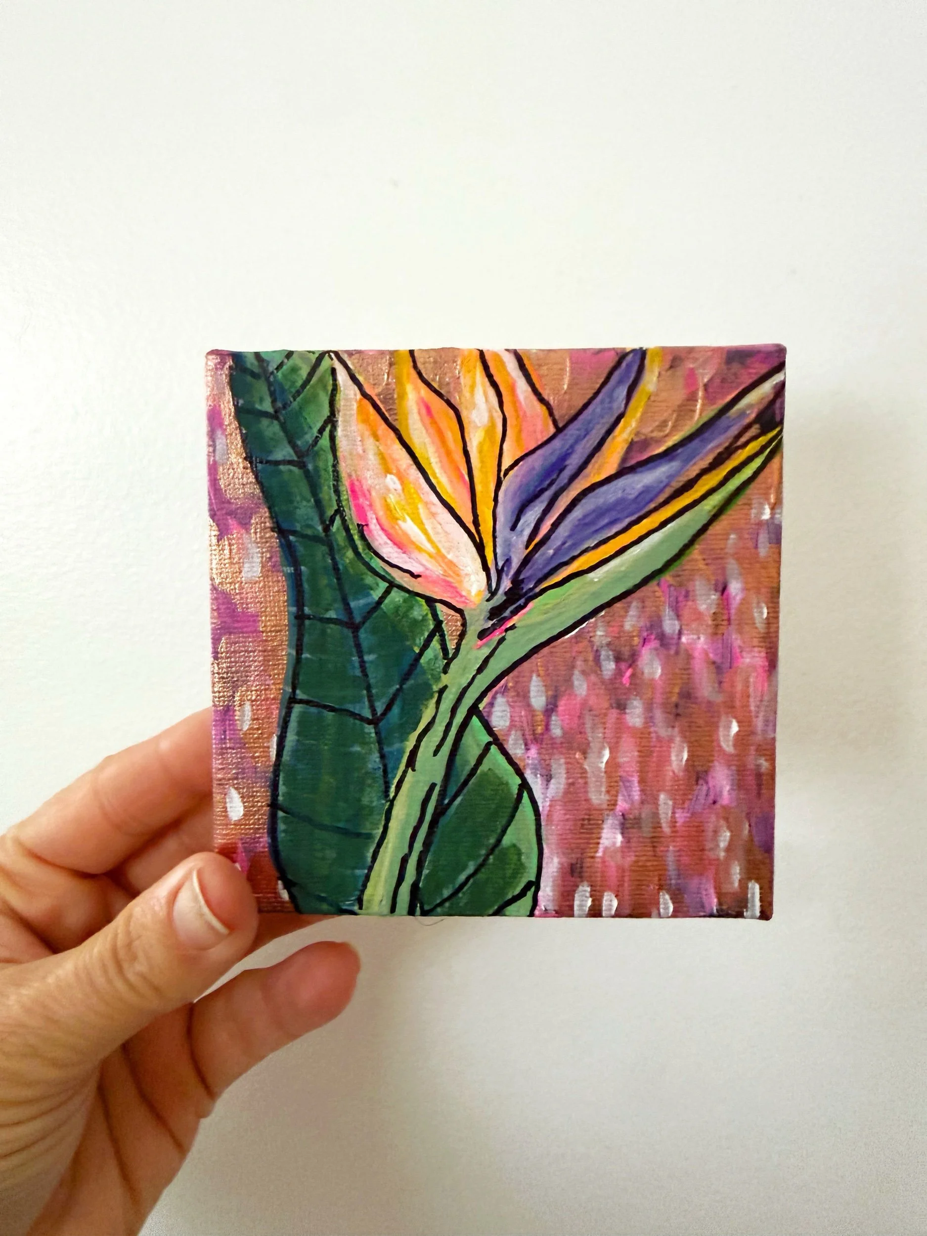 I created these 4x4 mini originals for the color lovers. They’re my signature style—expressive, bold, and unapologetically vibrant—distilled into a palm-sized keepsake. From soft, layered roses to tropical greens against a peachy glow, these are hand-painted pops of personality for your home.